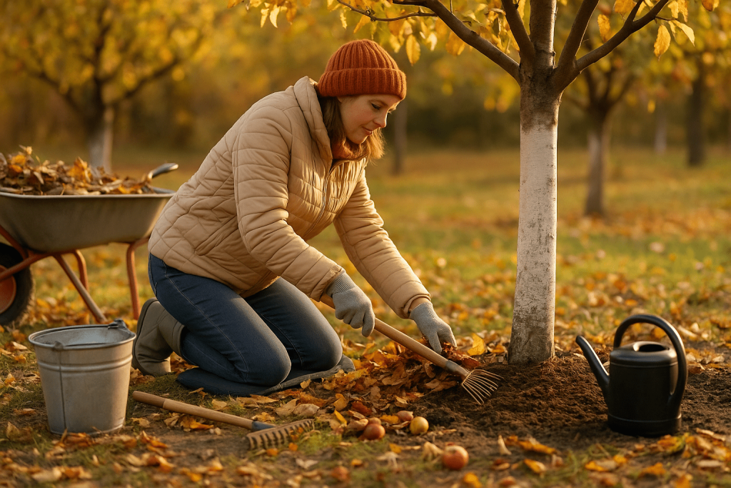 - Уборка. Соберите падалицу, обрезки, больные листья — всё это лучше вынести с участка или сжечь в безопасном месте. Здоровую листву можно отправить в компост.