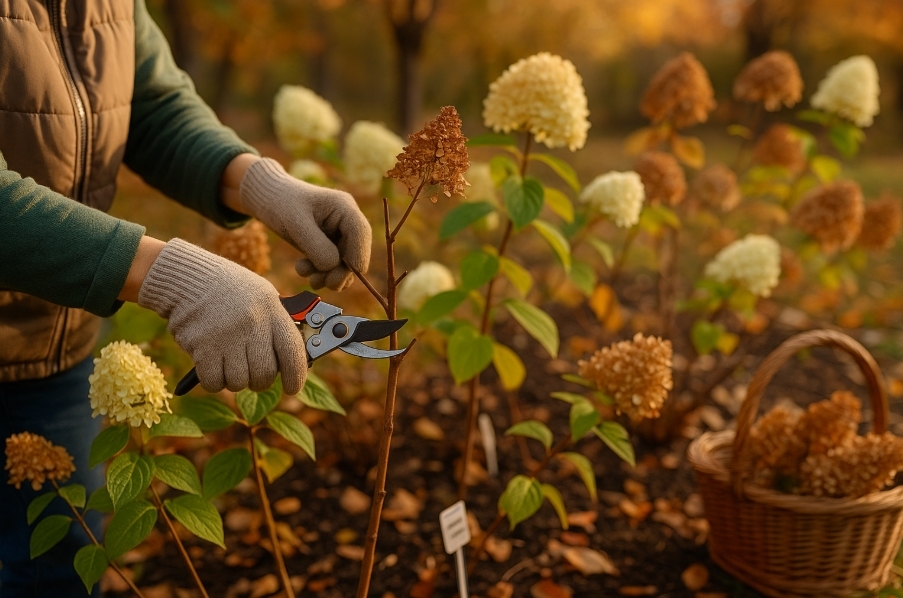Осенью — только санитарная чистка + снятие соцветий. Формирующие укорачивания — после цветения летом либо ранней весной, но осторожно.